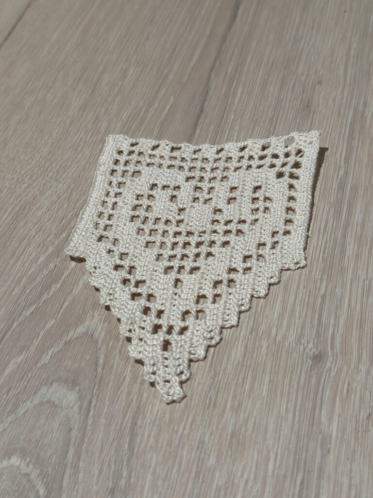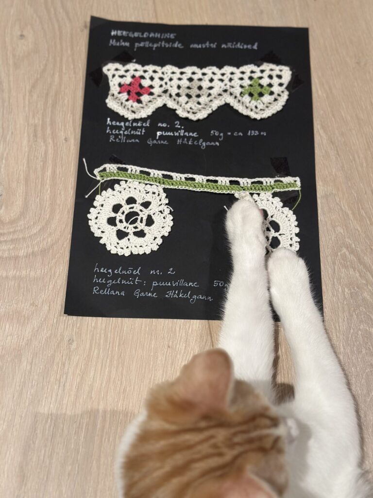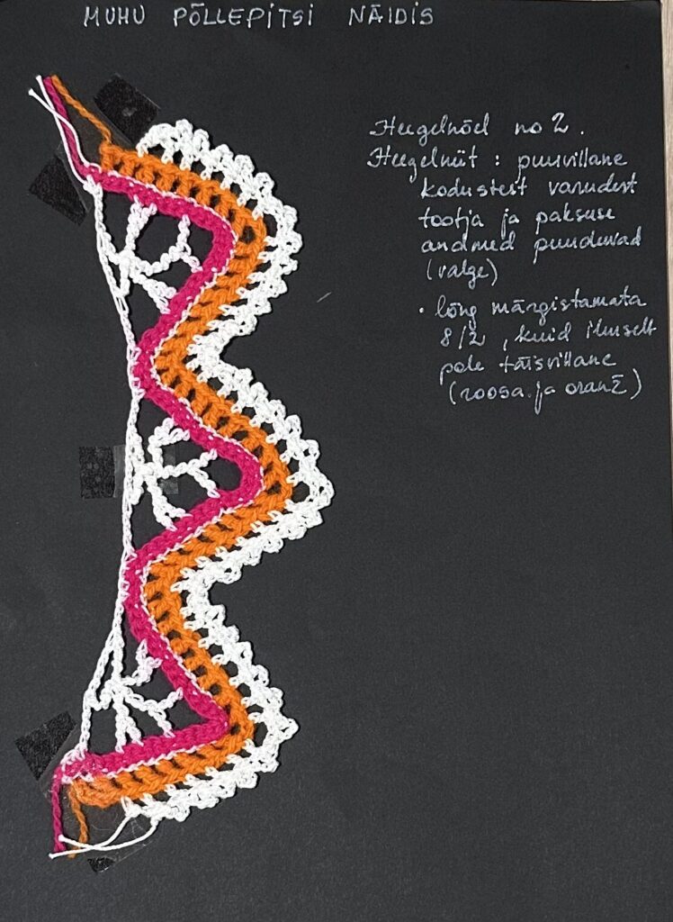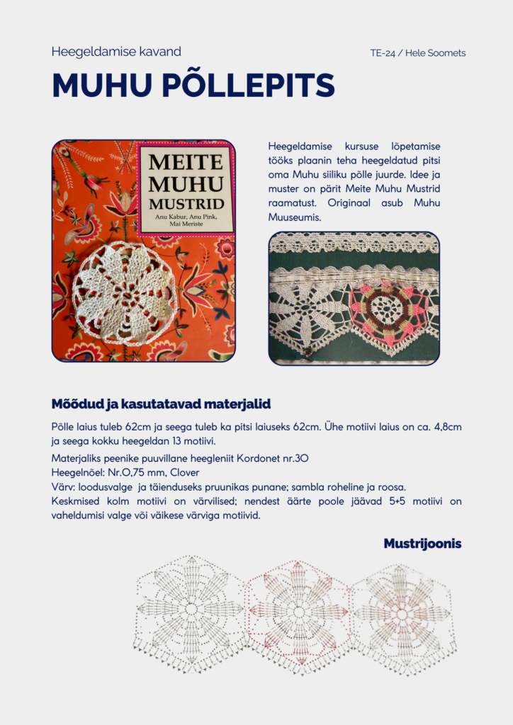 Heegeldamise kursuse lõpetamise tööks tegin heegeldatud pitsi oma Muhu siiliku tulevase põlle juurde. Idee ja muster on päris Meite Muhu Mustrid raamatust. Originaal asub Muhu Muuseumis.