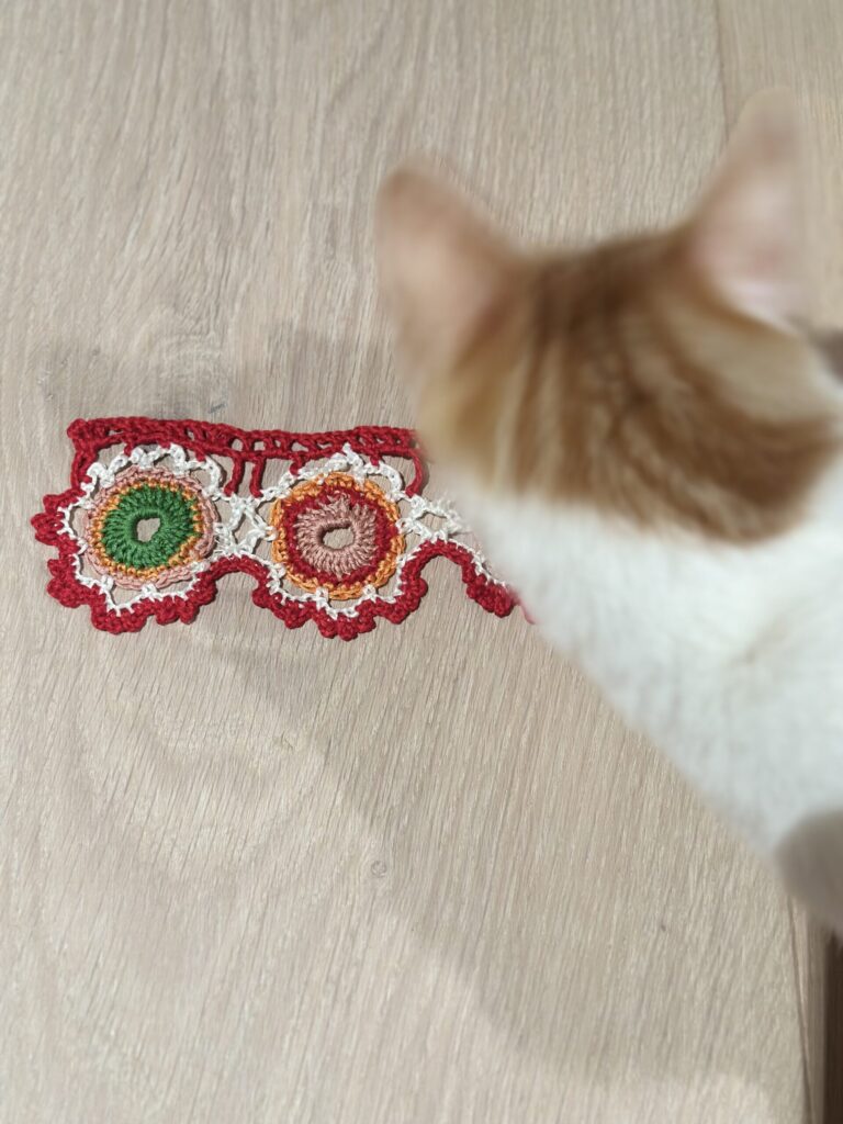 Materjaliks vaLge puuvillane heegelniit nr.50 ja erinevad mulinee niidid (2x), heegelnõel: Nr.0,75 mm, Clover Värv: loodusvalge ja täienduseks pruunikas punane; sambla roheline ja roosa.