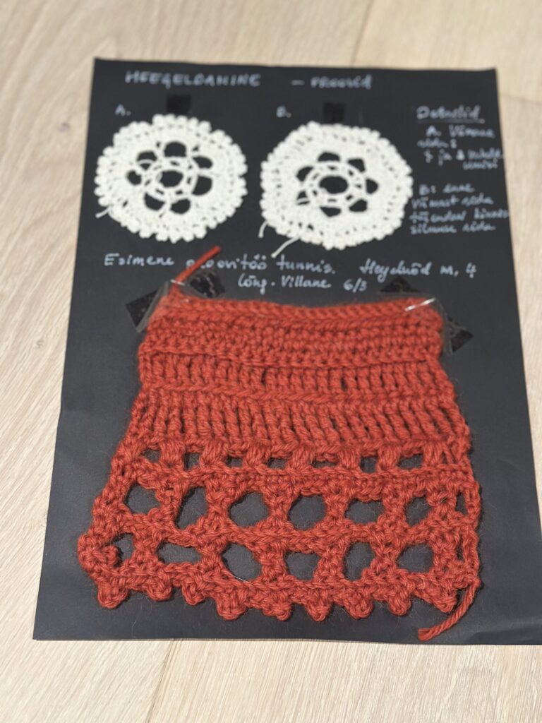 Heegeldamise kursuse jooksul oleme teinud väga erinevaid tööproove – heegledanud Muhu, Hiiu, Kihnu ja Setu pitsi. Lisaks fileeheegeldus ja tuniis tehnika.