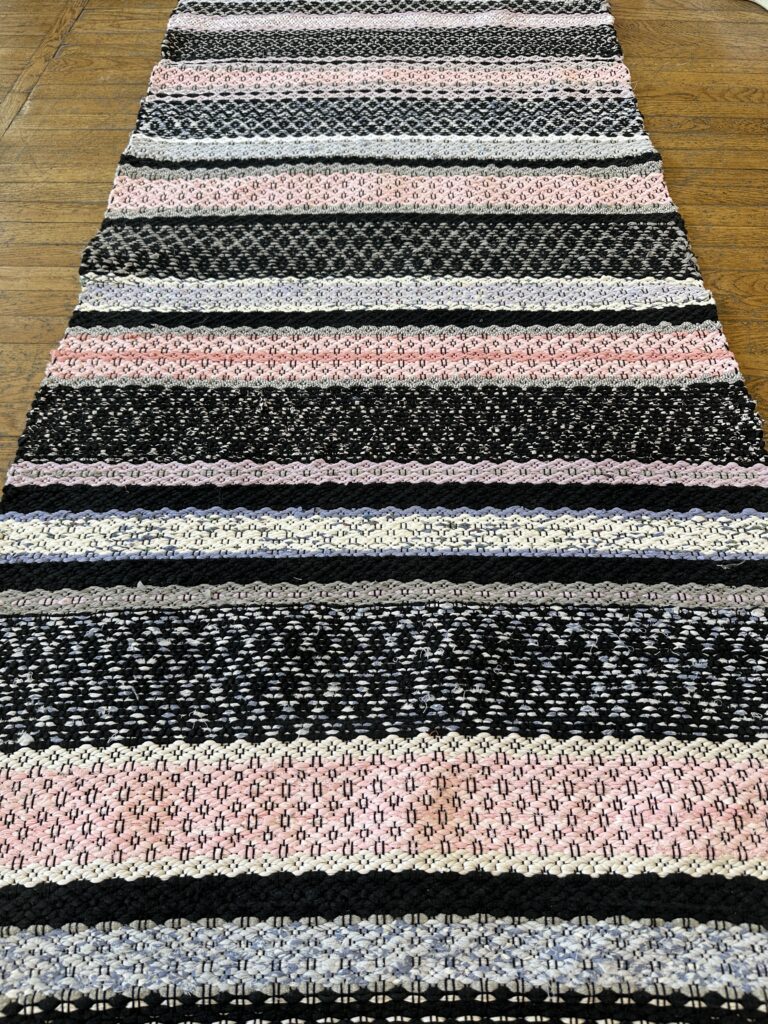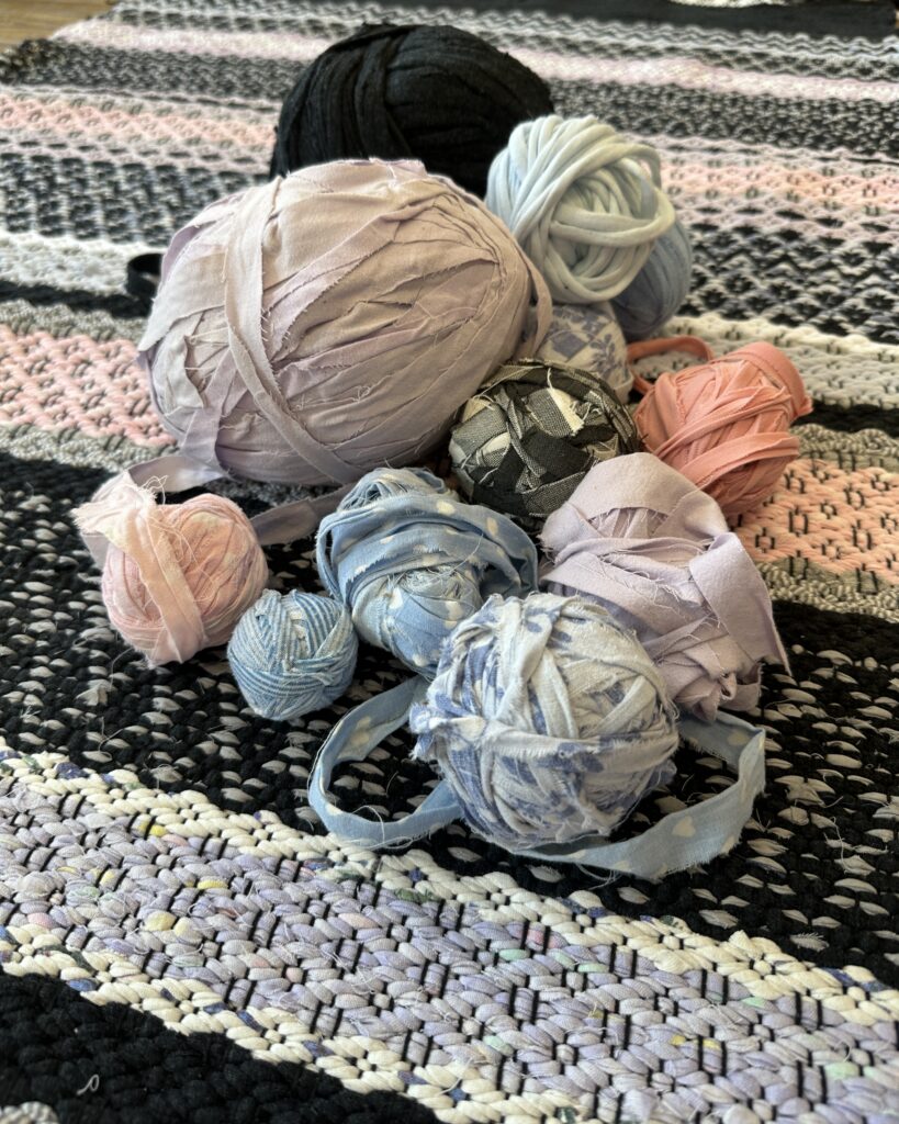 Koos kangasteljega jõudis minuni 4 kotti vana kaltsuvaiba materjali – väga erineva kvaliteediga, paksuse ja värviga. Mõnda vaid mõni rull, teist hulganisti. Valisin musta ja roosa-lilla-sinised toonid, et kududa vaip tudengile Tartusse.