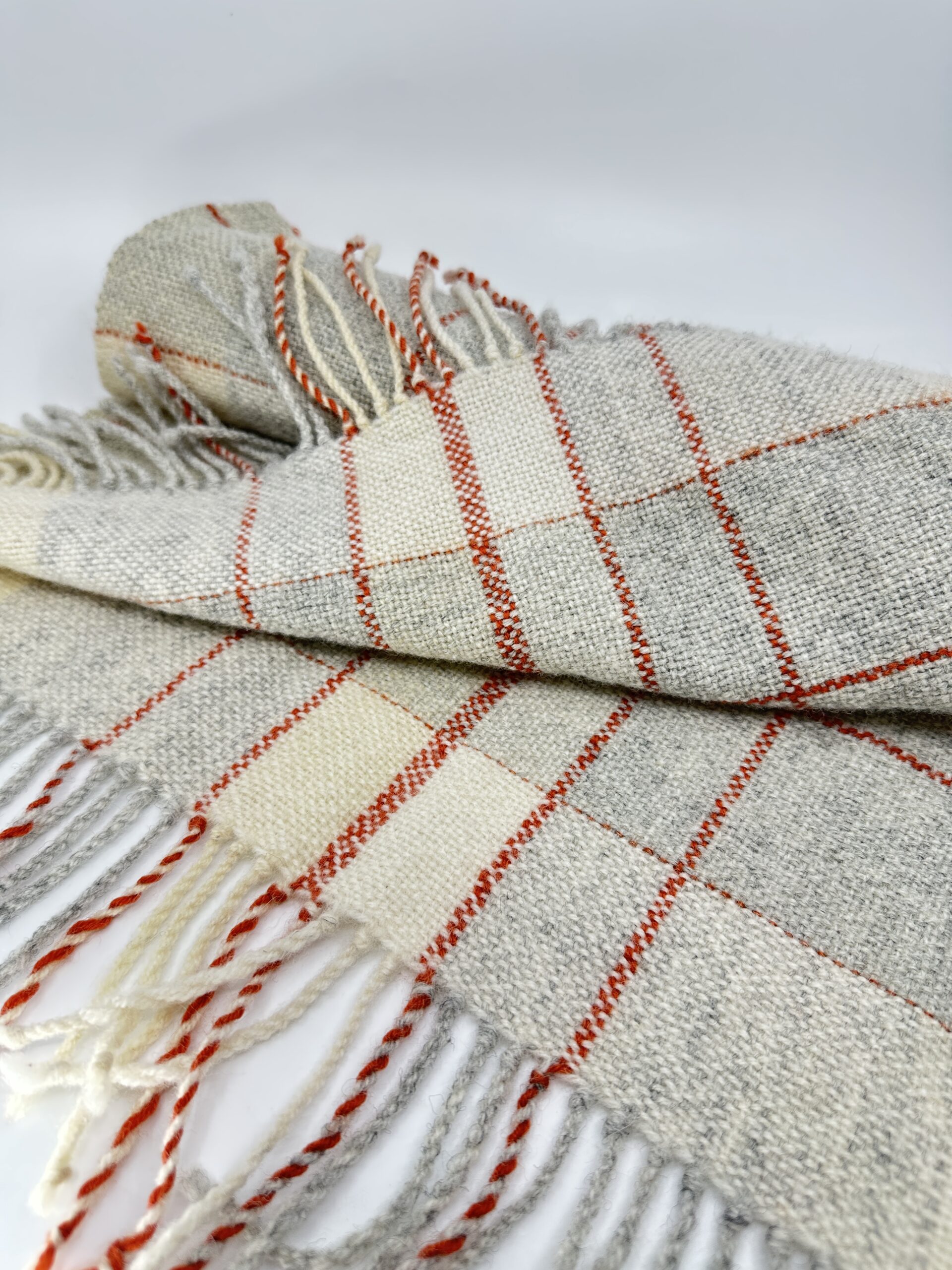 Esimene kangastelgedel kootud töö – villane ruuduline sall.