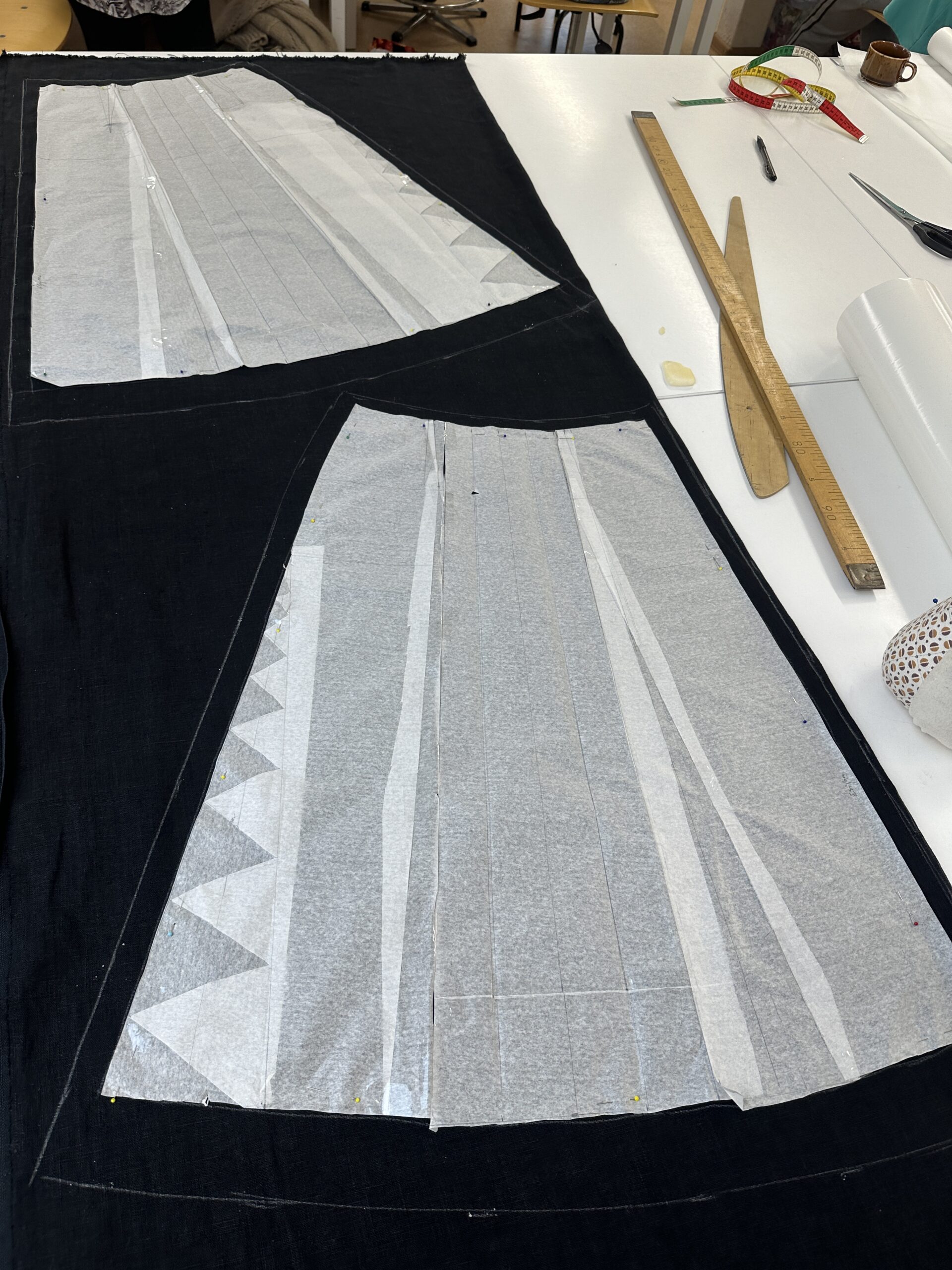 - Põhilõike kohandamine – minu puhul sisselõigete avamine nii ees, taga kui küljel. Kuna minu põhilõikel on taga kaks sisselõiget, siis selle asendamine ühega ja tekkinud “varu” meeldejätmine, et see arvestada vastandvoldi sisse.